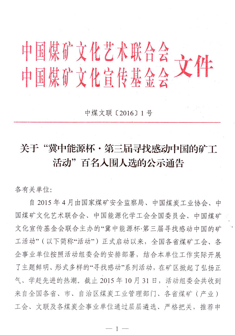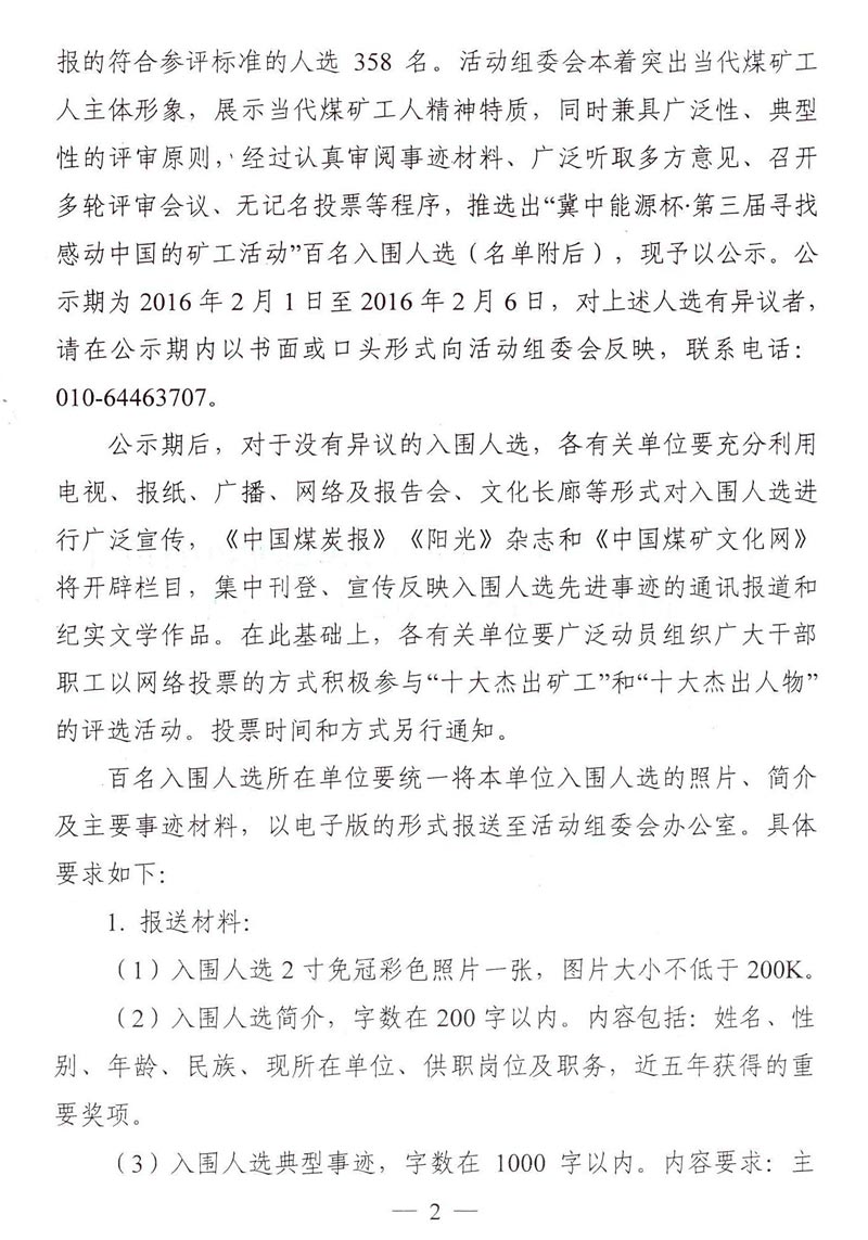 關于“冀中能源杯·第三屆尋找感動中國的礦工活動”百名入圍人選的公示通告 來源: 作者: 時間:2016-02-01 【字體:小 大】 附件:“冀中能源杯·第三屆尋找感動中國的礦工活動”百名入圍人選名單 智能標簽: 冀中能源 感動中國的礦工 百名入圍 相關內容 分享到: 【打印正文】