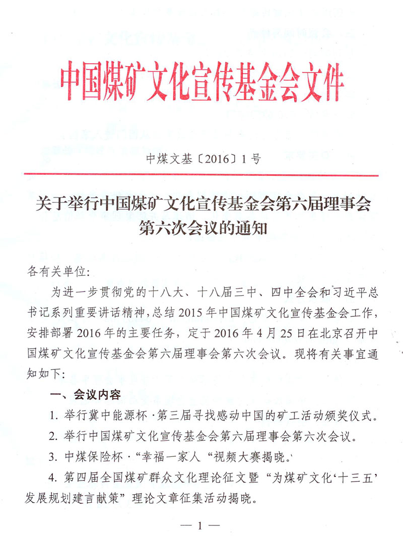 關于舉行中國煤礦文化宣傳基金會第六屆理事會第六次會議的通知