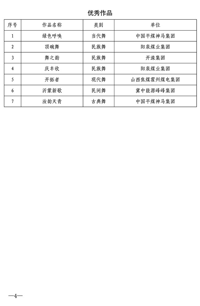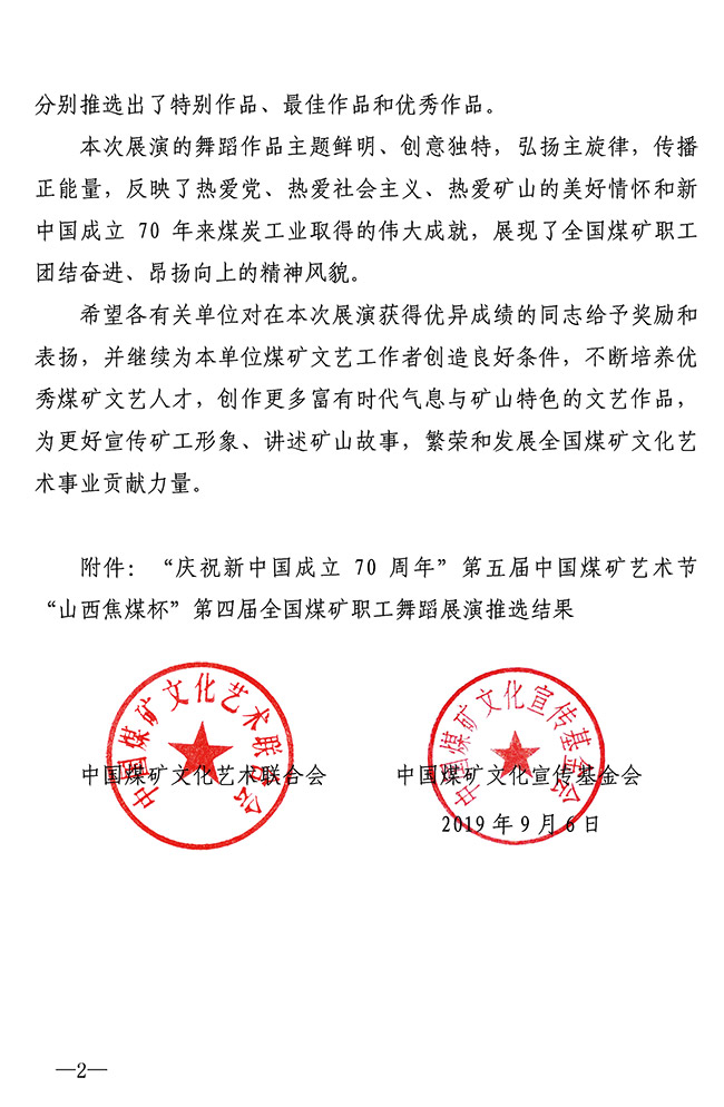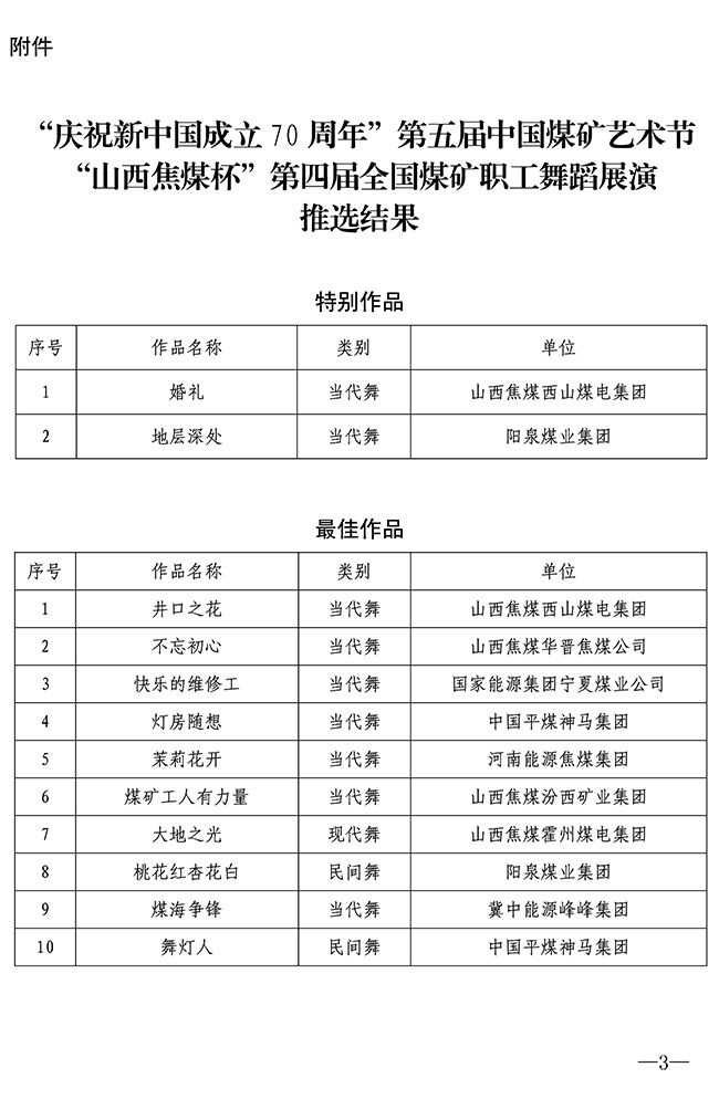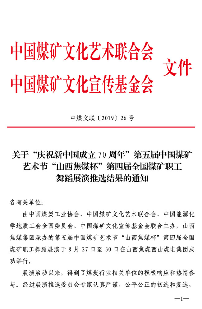 關于“慶祝新中國成立70周年”第五屆中國煤礦藝術節“山西焦煤杯”第四屆全國煤礦職工舞蹈展演推選結果的通知
