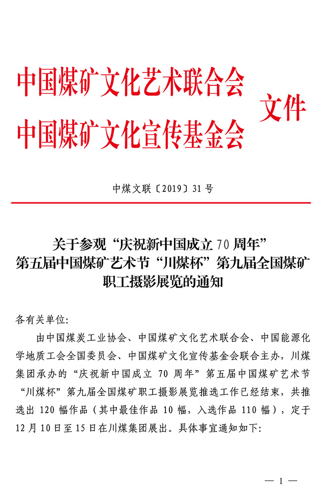 關(guān)于參觀“慶祝新中國(guó)成立70周年”第五屆中國(guó)煤礦藝術(shù)節(jié)“川煤杯”第九屆全國(guó)煤礦職工攝影展覽的通知