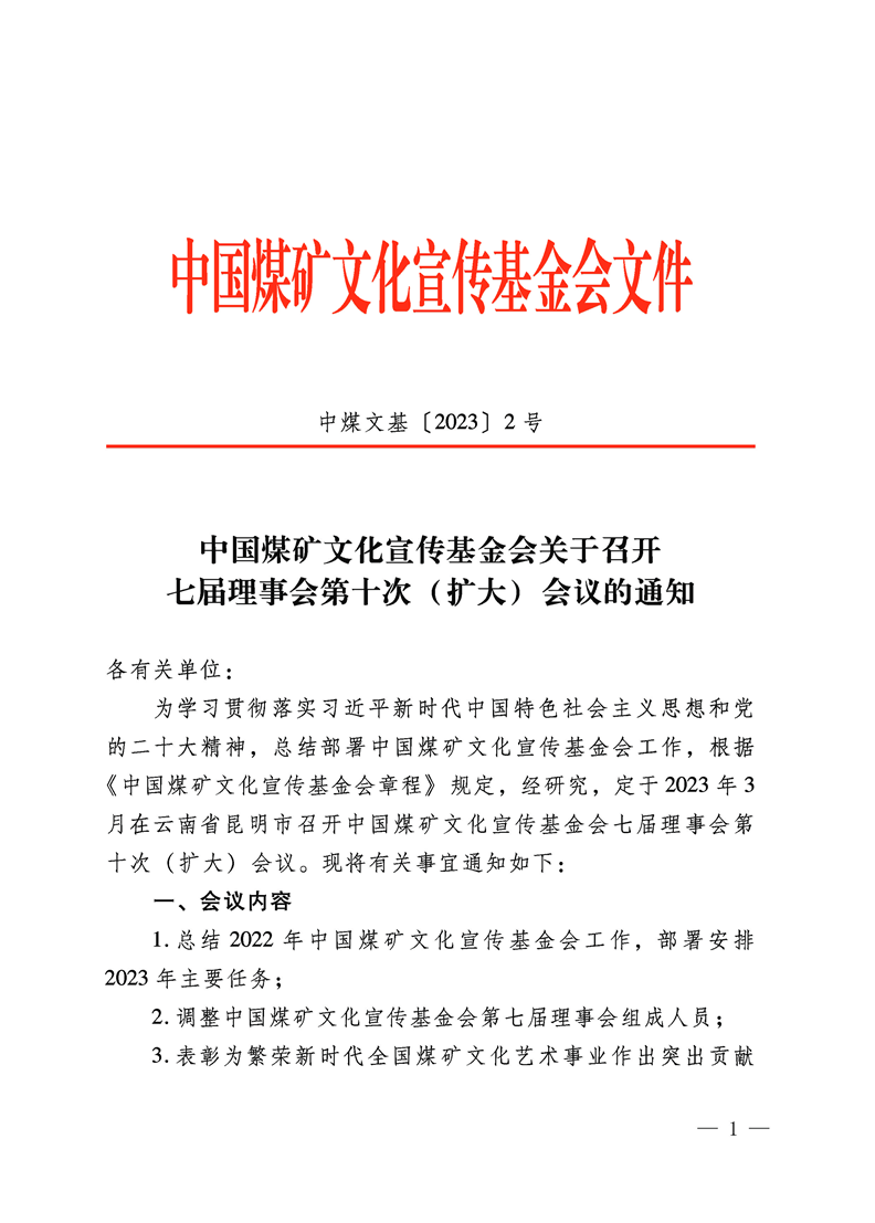 中國煤礦文化宣傳基金會關于召開七屆理事會第十次(擴大)會議的通知