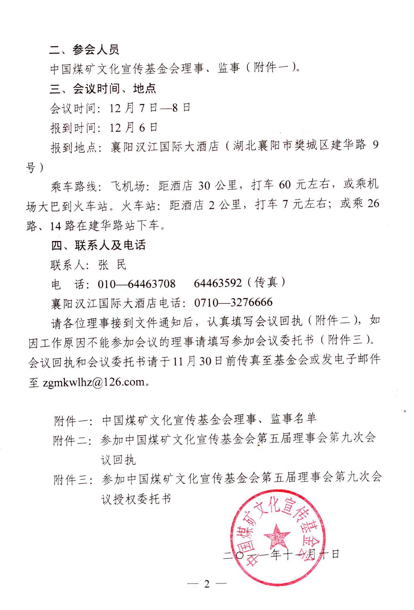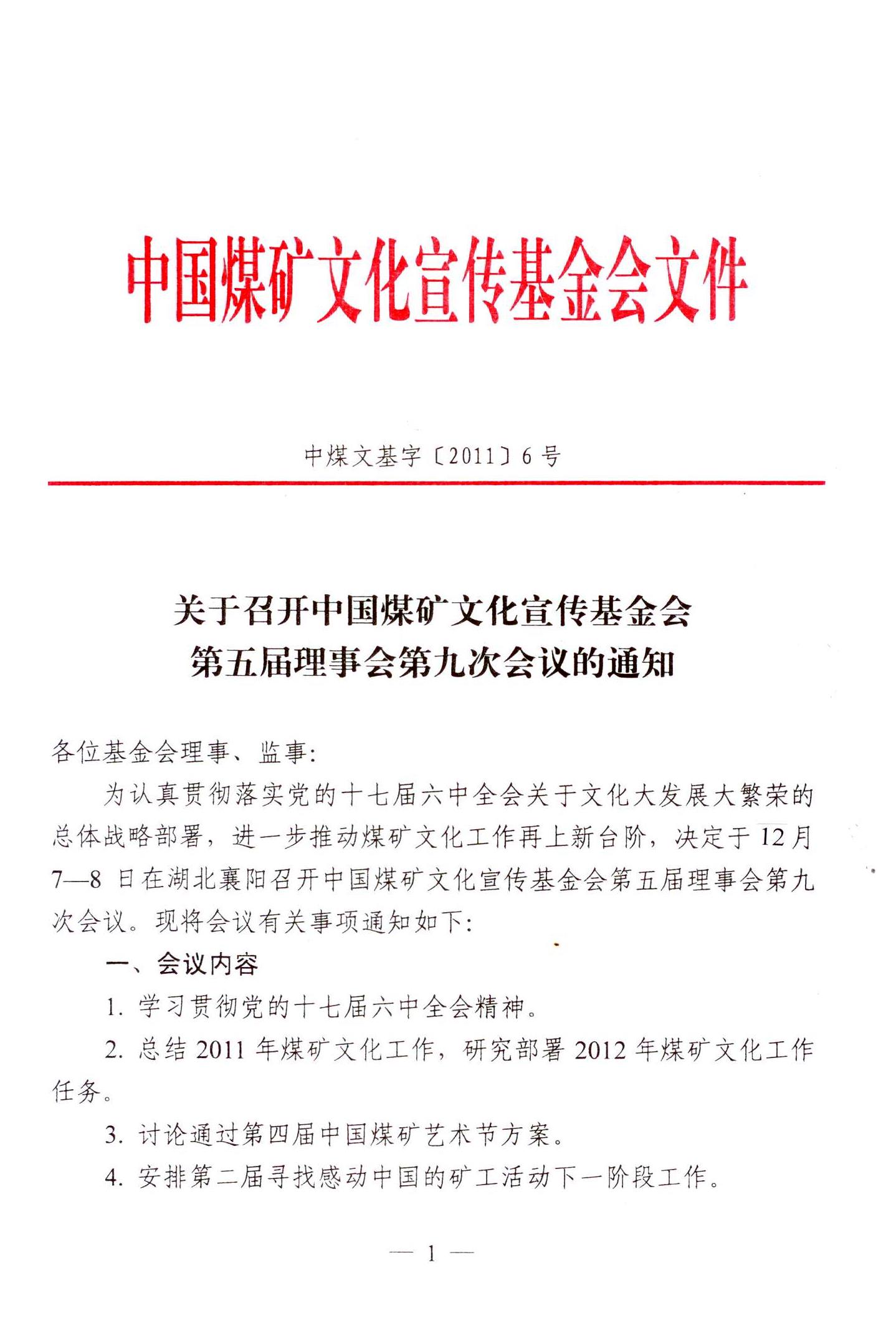 關于召開中國煤礦文化宣傳基金會第五屆理事會第九次會議的通知 來源:中國煤礦文化網 作者:煤礦文聯 時間:2011-11-18 【字體:小 大】 附件一:中國煤礦文化宣傳基金會理事、監事名單 附件二:參加中國煤礦文化宣傳基金會第五屆理事會第九次會議回執 附件三:參加中國煤礦文化宣傳基金會第五屆理事會第九次會議授權委托書 分享到: 【打印正文】