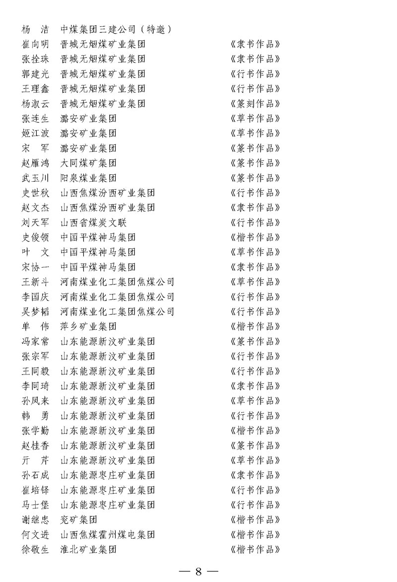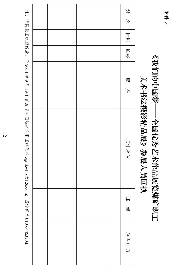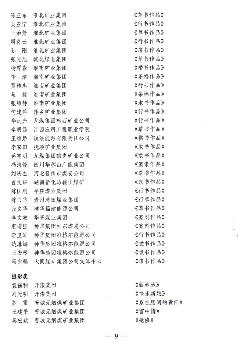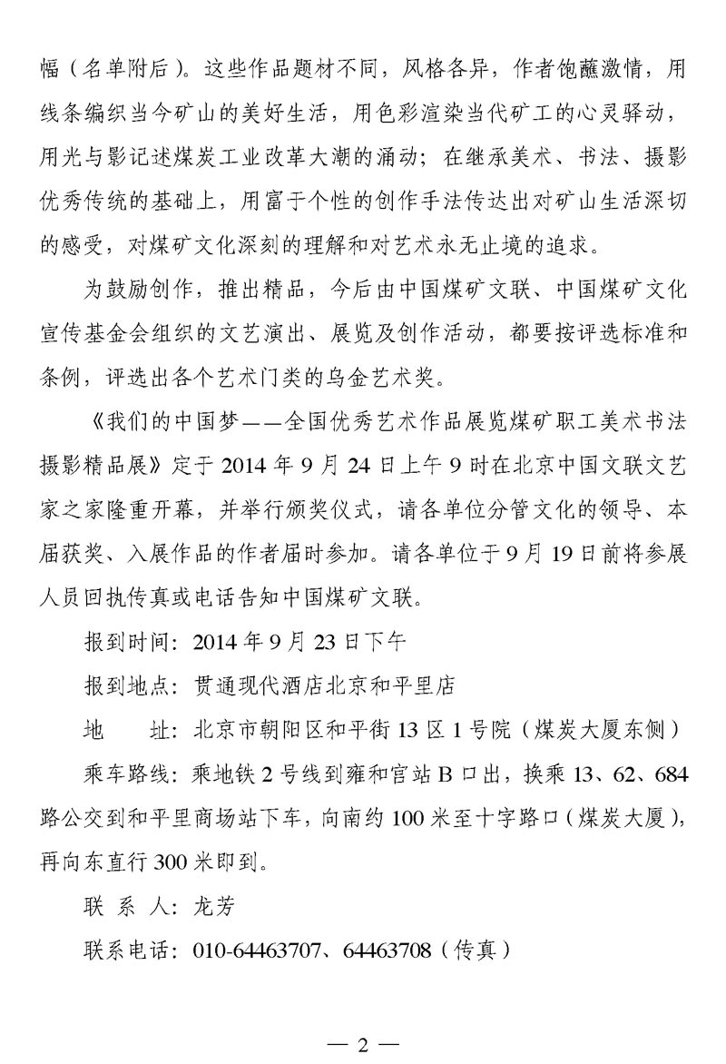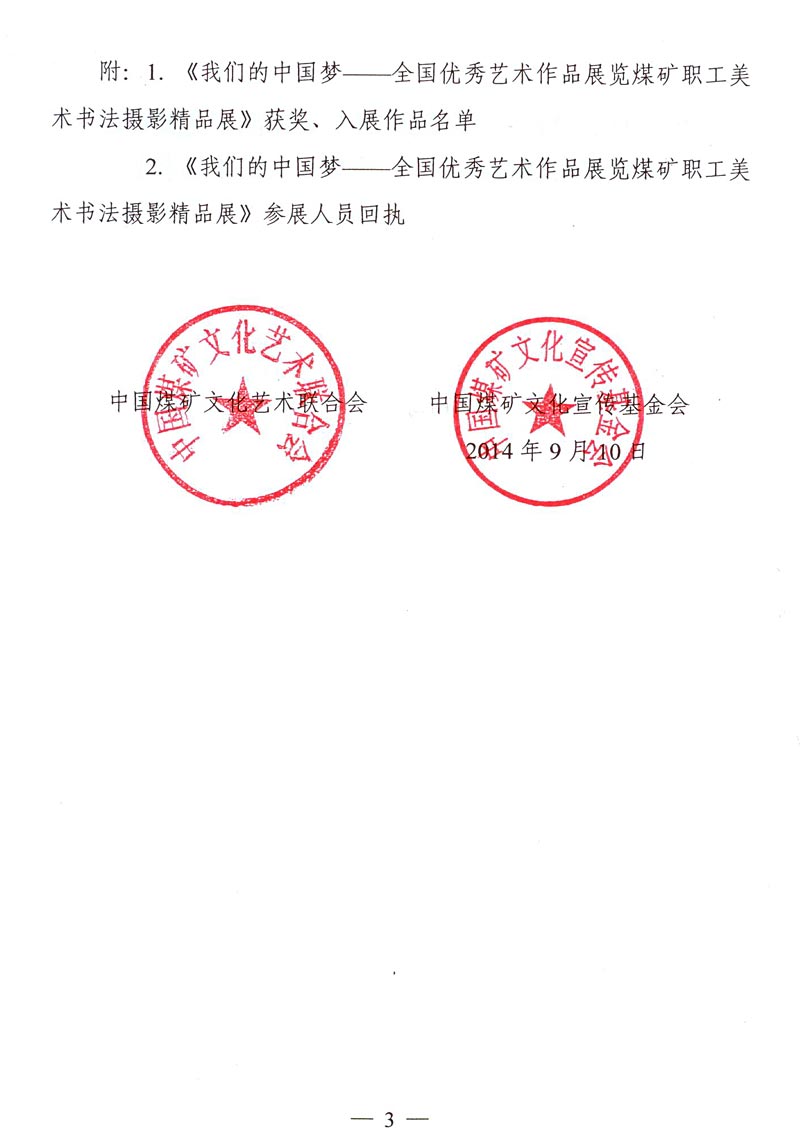 關于《我們的中國夢——全國優秀藝術作品展覽煤礦職工美術書法攝影精品展》評獎揭曉暨組織獲獎作者晉京觀摩的通知 來源:中國煤礦文聯 作者:中國煤礦文聯 時間:2014-09-12 【字體:小 大】 附件1.《我們的中國夢全國優秀藝術作品展覽煤礦職工美術書法攝影精品展》獲獎、入展作品名單 附件2.《我們的中國夢全國優秀藝術作品展覽煤礦職工美術書法攝影精品展》參展人員回執 分享到: 【打印正文】