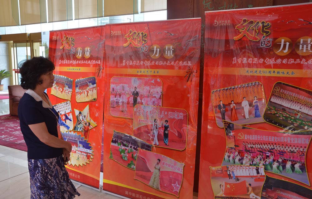 開幕式場外,代表在冀中能源集團職工文化建設展板前認真觀看