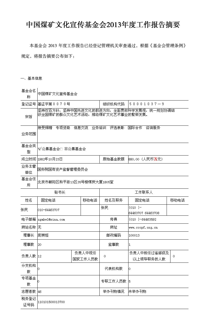 中國煤礦文化宣傳基金會2013年度工作報告(摘要)