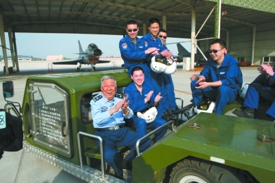 2010年5月13日,閻肅在空軍八一飛行表演隊(duì)參觀,與飛行員交談。郭興福 攝