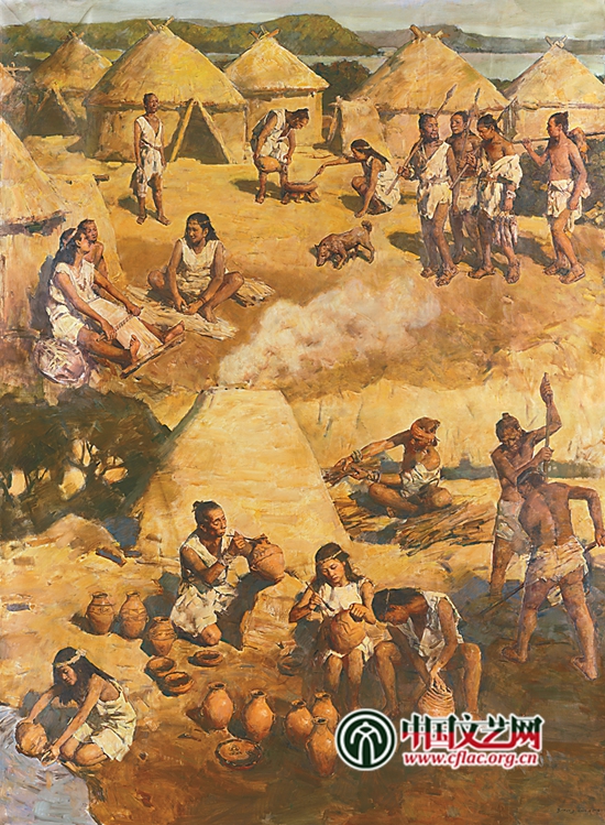 歷史畫、歷史主題繪畫,就內容而言,是以歷史事件、人物和史實作為基本內容的繪畫;就形式而言,它是造型藝術,通過繪畫、雕塑特有的表現手法來體現特定的歷史主題。它不同于歷史文獻的直譯,不是通史展覽中借以說明內容的插圖。因此,它既是歷史的,又是藝術的。歷史畫創作貴在立意和切入角度的選取與把握,它要求作者尊重歷史的本來面目,既要深入了解歷史,又要準確地、藝術地呈現歷史。而以歷史為題材的藝術創作與歷史畫創作的差別在于:前者的歷史主題只是創作媒介,藝術家完全可以憑借個人的理解認知和審美趣味,用個性化的方式自由演繹;而后者則需要有明確的主題內容限定、嚴格的歷史史實求證、嚴謹的創作態度,以及經得起歷史拷問和“情景再現”或“凝縮表現”式的完整的藝術呈現。藝術家既非畫匠,便“不可不弘毅,任重而道遠”,用圖畫為歷史造像立碑,同為“治史”之道,亦謂藝術之大道。“創作工程”的入圍作者們以強烈的歷史責任意識和文化使命感,在專家組指導幫助下,認真研究所能搜集到的典籍史料,深入理解并尋求準確把握表現的角度,不斷深化對歷史主題內涵的認識,將集體(專家指點)及個人對歷史文化的思考和對藝術品格、精神價值的追求,自覺地貫注到對歷史風云、文明進步以及藝術形式表現的創作實踐中,向著每個人心中的目標高地努力登攀。作者孫景波為了創作好《貞觀盛會》,不光不避勞頓多次深入實地查考歷史建筑原型,與專家多番探討唐式建筑結構特點和大型朝會活動典儀的合理性,用心收集古代西域各國人物造型和服飾資料,還做了大量文字、圖片記錄和案頭筆記工作,為的是最優化地再現宏大的歷史場景、展示盛唐氣象。作者王宏劍是一位修養全面、技藝高超的著名油畫家,他矚意的《鴻門宴》以歷史上楚漢相爭為背景,為了藝術表現的真實性,他借助搭建模型手法以設計、組織情景再現的逼真場面,力圖還原想象中的歷史真實。而王贊、潘鴻海、郭北平等作者的《河姆渡文化》《良渚文化》《仰韶彩陶文化》則需要依憑有限的考古出土文物和文字記載,充分發揮想象和邏輯推衍,以期描繪先民部落的自然生活情態。這樣的創作主題在給了他們限制的同時,又為他們敞開了自由想象的空間,美術家所需解決的,就是在這個有限的空間中,如何藝術地羅織起“真實、可信”的歷史場景。如果說跨越歷史數百年、涵蓋了各類門派的《中華武術》為作者胡永凱給出的是如何以高度概括、凝縮的手法,既要表現中華武術的多樣豐富性又能體現不同門派歷史源遠流長的難題的話,那么《王陽明心學》則是考驗作者孔維克如何通過繪畫視覺形式呈現“心”的精神性抽象因素,體現中華文化思想理念;而《屈原與楚辭》中那瑰麗恣肆、極富文采和想象力的辭賦《離騷》中跌宕變幻的內容情節,如何通過畫面組織恰切地與歷史人物互為映襯呈現,如此等等。歷史的藝術和藝術的歷史問題在考驗著藝術家的智慧。為了能夠體現創作主題內容的準確性,為了能夠將美術家的主觀意圖和專業擅長與主題內容有效地結合起來,在專家們的指導下,作者們普遍數易其稿,有的十數易稿,推倒重來,再推翻、再重來,可謂是殫精竭慮、精益求精、寢食廢忘、全力以赴。