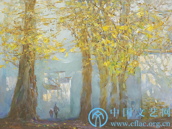 于是,鮑加從關注社會轉向聚焦自然,從對宏大場面的渲染轉向對平凡景觀的捕捉,從傾心于熱烈的壯美轉向詩意的自然美。他越來越多地表現風景,并開拓出一片新天地,探索著獨特的審美境界。“我們可以看到滋生于安徽大地的新安畫派及美麗的皖南對鮑加藝術的影響。他贊美自然、歌頌勞動、深刻而全面地展現現實生活,他堅實的藝術耕耘和著時代的節律,使得其藝術充盈著勃勃生機。在純粹的風景繪畫中,他以放松而坦蕩的心境,傾情于綠、藍的色調,而光的折射則遙接著印象主義的繽紛。他的藝術伴隨著人生,從題材的政治性、現實性,從內容到形式,從力求社會教育功能到藝術的審美作用,實現著一步一步的價值追求。”吳為山說。就像鮑加的《銀杏樹下的金色民居》,詩意淳厚、情味率真;《新安江畔》則氣度平和、富有韻味。即便是在自然風物的創作中,鮑加也堅持現實主義的藝術風格,他的皖南風景都是面對自然直接寫生創作,散發出濃烈的生活氣息和溫暖的生活質感。在鮑加的油畫中可以窺見中國畫的意境,有濃郁的鄉土情懷,還有中國文人的詩情,山水風物的生命被畫家所激活而呈現出奕奕神采。正如羅工柳所言:“他的風景畫色彩含蓄和諧,形真意切,將內心感情與大自然完美融合起來,真正做到了‘畫從心出’。”在風景的表現中,鮑加更臻自在,他歸真返璞,回到了藝術創作的最初心靈起源。