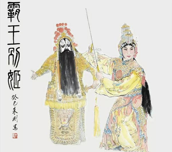 上海市美術館協會會長朱剛同時是一位長期專注于戲曲人物畫創作的畫家。中國的戲曲從大漠雪域到東海之濱,從白山黑水到天涯海角,從富麗堂皇的殿堂、優雅幽深的庭院到人頭嘈雜的江湖、廟會、集市,以唱念做打、手眼身法步一套系統的虛擬寫意的美感形式,道盡一個古老民族幾千年的酸甜苦辣,唱盡人性深處的五味雜陳、百感交集。也由此打動了無數藝術家的心,激發了他們的創作靈感和沖動,產生了一個五彩繽紛的美術門類:戲曲人物畫。