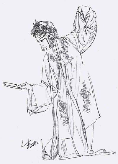 站在人生秋天的絢爛中,朱剛提筆的時候,一定會想到自己當年在生命夏天的陽光里,有幸遇到了以一曲《紅樓夢》“我來遲了”感動過無數國人的越劇老藝術家徐玉蘭。年輕帥氣的朱剛為供職的聲像出版社的戲曲音像制品偶爾畫起戲曲人物的封面,得到前輩大師徐玉蘭的熱情鼓勵。偶然成就了必然,就此,戲曲人物畫,成了他一生的藝術追求。也就此,那無數的戲曲速寫讓表演的瞬間變成了藝術的永恒。