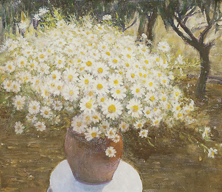 馮真在1956年到蘇聯列賓美術學院油畫系學習,1962年畢業歸國后在中央美院油畫系任教并進行創作?!拔覐牧匈e美術學院畢業后,不久就遇到‘文革’,所以油畫創作不多。后來我又轉到民間美術系,用很多精力和時間來收集和研究民間美術,離休后才又畫了一些油畫?!瘪T真說。展覽中,《北京西山秋色》紅葉似火、黃葉如金,《雛菊》清新淡雅,《陽光下的露臺》溫馨明媚,給觀者帶來歲月靜好的感覺。如杜鍵所說:“在他們后來的油畫和中國畫的創作中,都有新年畫創作中給他們烙下的純樸、樂觀、溫厚的印記。”