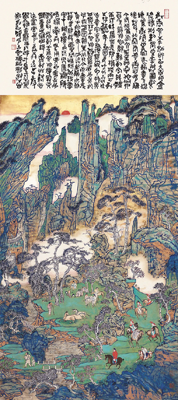 值得一提的是,本次展覽入展了幾幅張友憲“再創作”的作品。他十幾歲的時候曾在傅抱石先生后人家中有幸見過先生的一幅《汨羅江畔》,魂牽夢縈幾十年,于是在十幾年前創作了作品《汨羅江畔》,去年又在作品上做了進一步改動,使主題更加突出。另一幅《蒼茫暮色》曾在6年前于上海中華宮展出并收錄進大型畫冊,他一直想把畫面上的主角從中年改為老年,去年夏天實現了這個愿望,自覺還是比較成功。這一次到淮安市美術館做個展,他覺得作品中景物仍然有進一步再創作的必要,所以利用淮安市美術館大廳所具有的條件,在原作上增色完成了這幅巨制。