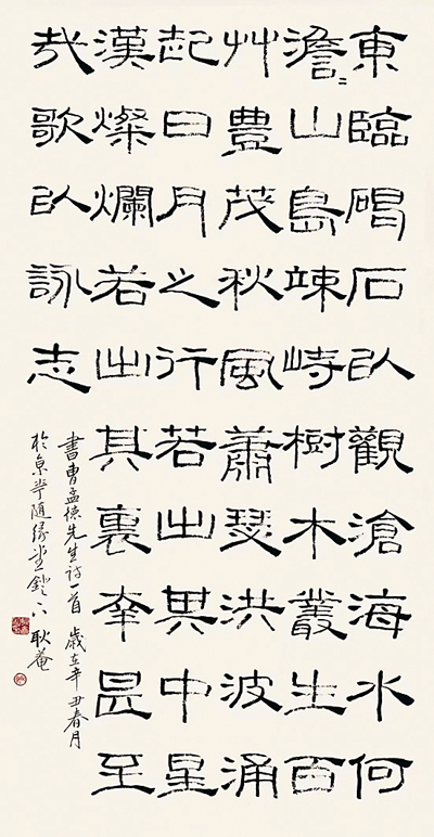 書法的繼承與創新已是老生常談,但如何創新,羿耿庵一直都在深思和探研。他始終認為,學書必須在深入學習古人傳統經典之后,再注重追求藝術的創新。他常常告誡自己,師古不能泥古,不然終是奴書。他60歲后自刻“六十我法”一印,從中表明了自己“求變出新”的藝術主張,也寄托了他銳意求變、立意創變的心路。他說:“學古人要變古人是十分迫切而首要的,只有背叛老師才能生,搞藝術要敢于求變、善于求變,如人天天變老,字不變不行。書法是有淵源的,不同時代的書法面貌有不同的變化,從殷商到兩周,兩周到秦漢、再到唐宋,書風、書體是逐步變化的,這說明變化具有時代性,故意人為的變化是不行的,學古人不是目的,最終要能學古人而能變古人,逐步創立自家風格。 ”羿耿庵近作草隸作品《林散之先生詩》從漢簡帛書中汲取養料,既具深厚的傳統書法功力,又有豐富的筆墨神韻,在繼承傳統漢隸的基礎上多有創新,該作品將篆書中最講究的結體、草書中最傳神的筆墨情趣有機地融入到隸書中去,又把簡帛書的自然天真之趣與碑刻隸書的渾厚古樸之氣有機地結合起來,形成了獨特的個人風格。