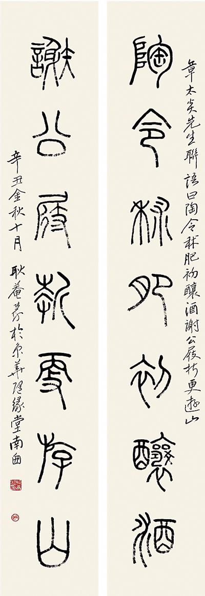 羿耿庵的篆書從秦篆入,并上探兩周金文、殷商甲骨文,早年曾對秦篆名跡《泰山刻石》《嶧山刻石》等下過較深的功夫。23歲時他以鐵線篆筆法所臨的《泰山刻石》手卷,便受到其恩師沙曼翁先生的贊譽并親筆題引首“秦篆正宗”。近年羿耿庵尤對《石鼓文》研究頗多,用功甚勤,并用《石鼓文》筆意融入小篆,使所書小篆更顯古樸渾厚,其篆書作品《章太炎先生聯語》用筆參以古金文之厚重,結體往直中求、減少盤曲,“不向曲中尋”,由此筆勢更加遒勁,用筆用墨極富神韻。