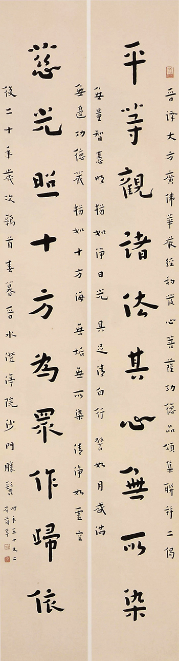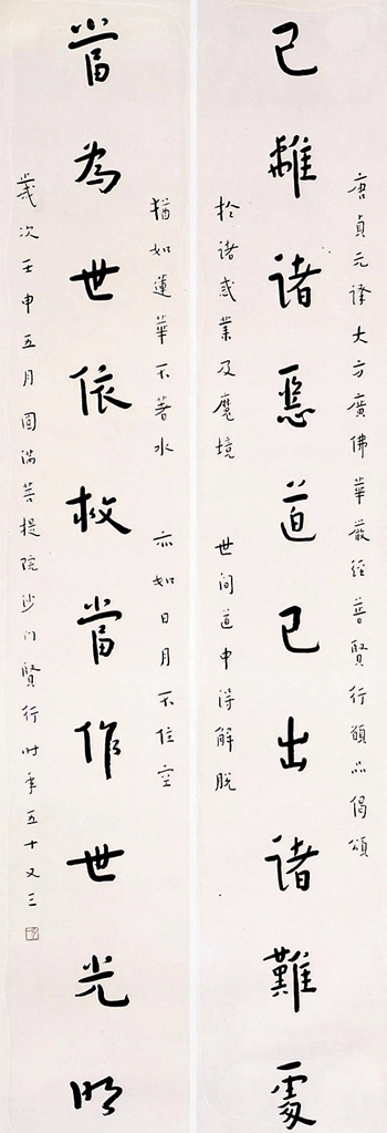 如果說,李叔同出家前寫書法,與所有世俗書法家一樣,存在著為書法而書法的專業技藝敬業理念,而出家后,作為僧人的弘一書寫書法不是志在書法的外在形式,而是志在書法的書寫內容,他寫佛經、寫佛偈、寫佛理對聯和條幅,都是一種自我修行或傳播佛法的方法,包括他親自為弟子豐子愷的第一本《護生畫集》題寫詩詞、說明文字,皆不是為了“彰顯”他的“書法作品”,而是為了傳播萬物有靈、眾生平等的大愛,為了弘法利生,為了拯救天道人心。
