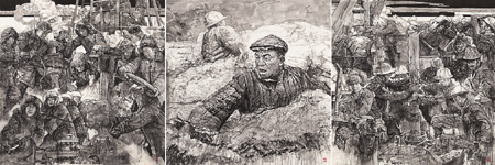 歷史題材創(chuàng)作想要創(chuàng)新并非易事,因為歷史事件是大家都十分熟悉的,將畫面畫得太抽象會缺乏共鳴,關(guān)鍵是要將形象畫到位。縱觀《激情燃燒的歲月》,既有扎實的寫實造型能力,又清晰可見筆性墨韻的淋漓揮灑,強烈的黑白灰構(gòu)成對比下的形式美感在這幅歷史題材創(chuàng)作中達到了理想呈現(xiàn)。