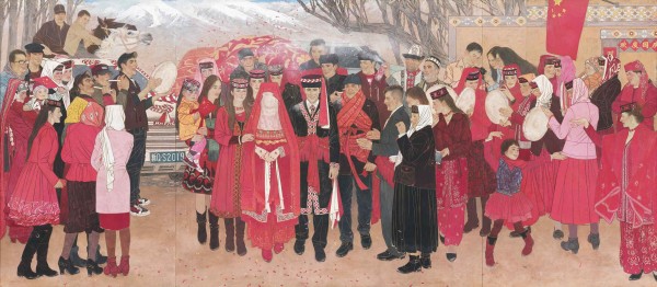 而有些創作工程則涉及當代史的描繪,這要求畫家既要深入生活之中,也要跳出生活之外,以史家之眼、畫家之筆來凝固當代現實形象。如張見等的《助夢》所表現的精準扶貧,通過富于民族特點的人物形象塑造,生動揭示了偏遠鄉村走上富裕道路的主題寓意。其畫面色彩的清新、人物刻畫的感人、工筆勾染的匠心,都體現了新時代中國畫在描寫現實生活中獲得的藝術語言突破。而王奮英的《春暖十八洞苗寨》、盧志強的《建設中的巴基斯坦瓜達爾港》、何家英等的《雙喜臨門》和馬鑫的《共享單車》等,則把描寫的事件情節與畫面結構及富于個性的藝術語言統于一體,既探索了繪畫情節描繪的可能性與獨特性,也力求把現代主義對視覺形式研究的成果融入其中。這些畫作同時還注重寫意筆墨的發揮、工筆勾染技巧的精湛,從而使這些尺幅巨大的中國畫具有新的時代詩意。