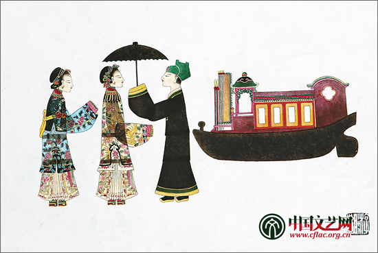 2009年,我又創(chuàng)作了插畫《白蛇傳》,再次幸運入選了第十一屆全國美展。創(chuàng)作之初,我翻閱了大量民間文學(xué)《白蛇傳》的繪圖版本,其中最精美絕倫的是我國著名連環(huán)畫名家任率英和孟慶江先生創(chuàng)作的連環(huán)畫《白蛇傳》,或色彩絢麗,或線條優(yōu)美,讓人大開眼界。贊賞之余,如何讓自己的創(chuàng)作杜絕雷同、別具一格,便成為嚴(yán)峻挑戰(zhàn)。怎樣讓大眾熟悉的文學(xué)人物形象更具視覺沖擊力,就必須在人物造型和表現(xiàn)手法上有所突破,而皮影戲這個鄉(xiāng)土視覺文化元素的引入就成為破解難題的訣竅。為此我查閱了大量的皮影資料,專程拜訪了老藝人王錢松,掌握了許多鮮為人知的創(chuàng)作素材。如小姐與丫環(huán)、伙計與掌柜、和尚與道士、文人與武將的服飾差別,皮影兵器、樹木、家具的表現(xiàn)方式等。為進一步增加地域文化特色,海寧燈彩和剪紙也被融入到了我的作品中。我花了大量的時間畫這些桌椅、游船、橋、寶塔,還特意為這十幅圖的題目刊刻了十枚印章,由于連環(huán)畫規(guī)定的尺寸有限,我的每一幅畫的畫心只有29×41厘米,所以相應(yīng)的人物和景物都必須縮小,故此系列作品的創(chuàng)作極費心力、極費眼神。