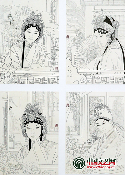 前不久我又創(chuàng)作了兩組《牡丹亭》的插畫。我國多位著名藝術(shù)大師都曾經(jīng)創(chuàng)作過連環(huán)畫《牡丹亭》,無論是戴敦邦、鄭家聲先生的彩繪《牡丹亭》,還是高云先生的線描《牡丹亭》,都用各自獨特的藝術(shù)構(gòu)思、生動精準(zhǔn)的藝術(shù)語言描繪了這一愛情故事,成功塑造出了杜麗娘這個美麗多情的女子形象。或許同為女性,我對于杜麗娘尤為欽佩,從初始的矜持、溫順到后來的叛逆、反抗,她在追求愛情過程中堅定執(zhí)著。這樣的一個鮮明而生動的藝術(shù)形象,讓我立刻萌生了繪制《牡丹亭》插圖的創(chuàng)作欲望。我的第一組插圖,采用的是白描勾線,以人物和環(huán)境的局部特寫來突出人物豐富的神態(tài)和微妙的思想感情;戲曲人物的頭飾和穿戴是非常漂亮的,細細地刻畫出來很入畫,并且以畫現(xiàn)代人物的方法來畫戲曲人物也可以跟其他畫家創(chuàng)作的《牡丹亭》區(qū)別開來,而用白描的形式則可以起到整體統(tǒng)一的效果。第二組插圖,我利用了古代版畫插圖的特點:構(gòu)圖嚴(yán)謹(jǐn),裝飾性強,黑白色對比強烈,畫面場景內(nèi)容豐富,線條挺拔有力,但是個人覺得畫面采用黑底白線的繪制方法會更新穎,視覺效果更好。
