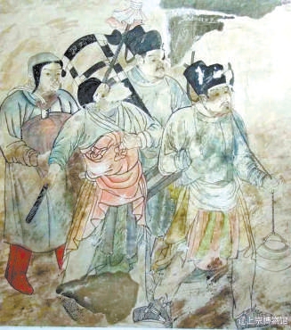《歸來圖》,遼墓上的契丹壁畫。圖中四人,三人為漢族裝束,第四人髡發(fā),雙手抱包裹。此圖顯示了遼宋交融期間契丹人的漢化。