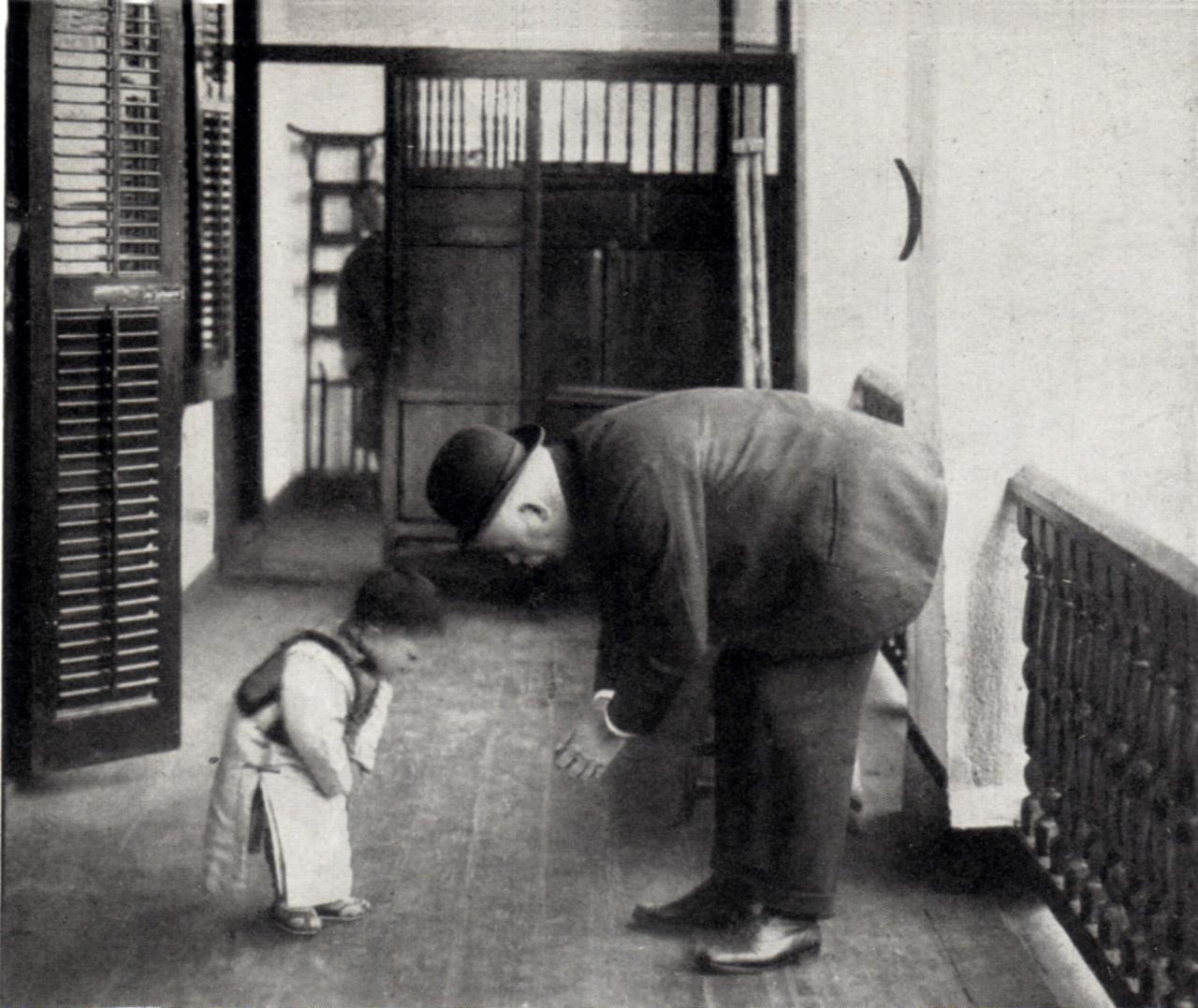 杭州廣濟醫(yī)院院長梅藤更在巡視病房時跟一位三歲小病人互致問候(沈弘教授提供)