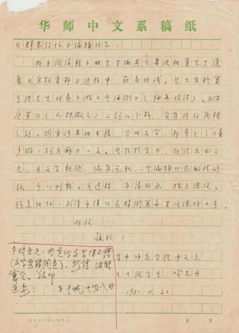1981年12月7日下午,《江海學刊》的兩位編輯許總、曹朋來到南京大學教授程千帆家,將一篇商榷文章放到他的案頭,同時還出示了文章作者寫給雜志社的信。文章針對的是由他整理的沈祖棻遺著《宋詞賞析》,其中關于秦少游兩首詞的分析,這位作者——華中師范學院中文系七七級學生喻志丹——有不同看法。《群眾論壇(叢)》編輯同志(按:《江海學刊》在1980年曾更名《群眾論叢》,1982年恢復):