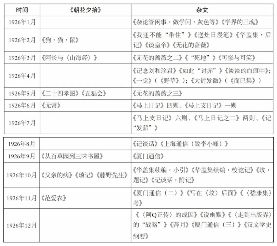 不妨把貫穿1926年全年的這兩個相互交織的系列篇目略加篩選,再按月羅列,以表格形式做一對比: