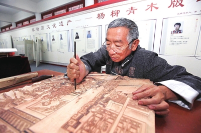 楊柳青年畫老藝人在雕刻年畫的木版 CFP