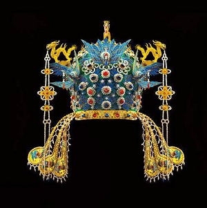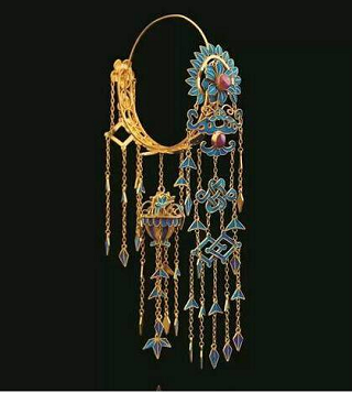 花絲鑲嵌包含兩種工藝:花絲是用金、銀做原料,拔成細絲,編結成型;鑲嵌就是把金、銀薄片捶打成形,把珍珠寶石嵌進去,制成裝飾品。整個工藝過程很繁復,首先要制胎,以便造型;再用堆、壘、編、織方法,將花絲成型,加以燒焊;再咬酸(酸洗)后燒藍或鍍金銀,再提亮。這是半成品,半成品上再“鑲寶”(珍珠寶石)。往往還要“點翠”,不是點綴翡翠,而是把翠鳥的綠中閃藍的羽毛,貼在花絲的空白點上(文物市場所賣老首飾,上面的翠藍色,用手一摸,往往掉下絲來,即翠鳥的羽毛)。