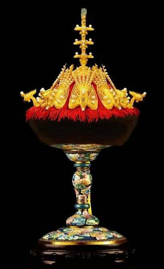 其技藝精湛,造型優美,品種多,具有明顯的中國特色和民族風格,凝聚著中華民族的聰明智慧和藝術創造力。因宮廷設立了手工業作坊和手工工廠,集中了全國的能工巧匠,使南北方花絲鑲嵌制作技藝得以交流,并融合少數民族工藝美術之長,成為了宮廷藝術的重要組成部分。花絲鑲嵌的代表作品有明代的萬歷皇帝金冠、清代的金甌永固杯、銀六方盆金桃樹盆景、金嵌珠寶朝冠頂、現代的珠寶天壇祈年殿、中華世紀龍等。