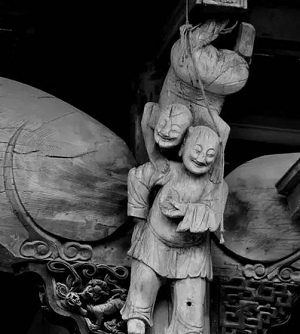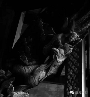 混雕:相當于雕塑技法里的圓雕,具有三維主體的效果,可多面觀賞,多應用于撐拱、垂花等部位,常利用混雕技法,將形象刻畫得非常精細,充滿生氣。