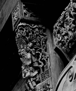 中國講求“天人合一”,崇高自然,與自然相融相生,所以,幾千年來,中國建筑一直以木構架建筑房舍宮府,形成了我國獨特的木建筑。建筑木雕則始于對部分構件的裝飾加工,使之符合于建筑審美的需要,久而久之,便成了建筑中不可缺少的部分,并融于整體建筑中,與白墻青瓦相呼應,構成了和諧統一的整體建筑外觀。同時,木雕的形象與庭園草木、室內陳設家具相互映襯,體現了中國人特有的精神與審美趣味。
