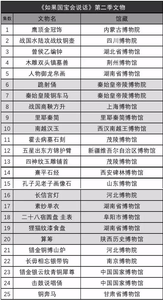 據悉,在第一季的陶器、玉器、青銅器之外,第二季也新增了漆器、石刻、簡牘、織錦等文物類型。本季以“超級連接,超越想象”為主題,講述戰國至秦漢時期的25件文物,并將繼續采取與觀眾平視交流的姿態,讓國寶活起來。