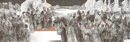 探索中國(guó)畫(huà)語(yǔ)言的現(xiàn)代方式,是當(dāng)代中國(guó)畫(huà)家的必然選擇。李寬在延續(xù)傳統(tǒng)文脈的基礎(chǔ)上沿變出新,在把握用筆、用墨等文人特質(zhì)的同時(shí),強(qiáng)調(diào)線形墨色的相互轉(zhuǎn)化,注重人物形象的深入塑造和畫(huà)面的整體節(jié)奏與韻律,強(qiáng)調(diào)畫(huà)面的體積感和筆墨的趣味性,在寬厚平實(shí)中張顯著從容和大氣,既有純正的傳統(tǒng)中國(guó)畫(huà)的筆墨風(fēng)儀,又充盈著生動(dòng)鮮活的個(gè)性表述。觀覽李寬新近創(chuàng)作的《東臨碣石》和《眾志成城》,在壯闊如一面墻一樣的畫(huà)幅里形象變換、時(shí)空交錯(cuò),畫(huà)面富于靜態(tài)力感又具有鮮明的時(shí)代氣息。用現(xiàn)代人的思維方式對(duì)傳統(tǒng)和現(xiàn)實(shí)題材進(jìn)行發(fā)掘與重構(gòu),通過(guò)能動(dòng)的主觀表達(dá),凝結(jié)出多維的繪畫(huà)語(yǔ)境,給人以多方位的啟迪與感悟。