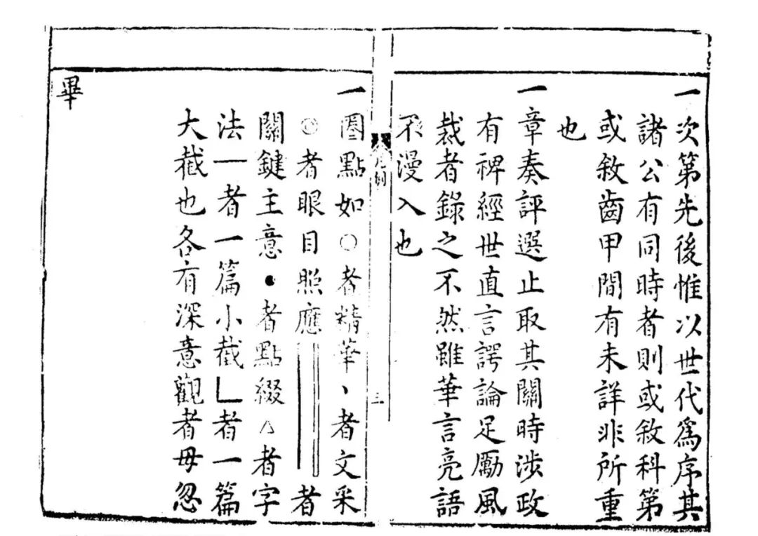一是以圈點符號來標(biāo)示選文的評價等級。例如晚明的舉業(yè)用書《新鐫選釋歷科程墨二三場藝府群玉》,由衢州書坊翁日新刻印。此書署焦竑、王衡同選,唐汝瀾注,邵名世、王時學(xué)同校,翁日新繡梓。焦竑、王衡之名當(dāng)系偽托,實際的編選、注釋工作應(yīng)由唐汝瀾承擔(dān)。唐汝瀾對所選科考二三場中論、表、判、策程墨的等級評選,皆以圈點作為標(biāo)示。對此,書前《新鐫選釋歷科程墨二三場群玉圈點凡例》有清晰的說明: