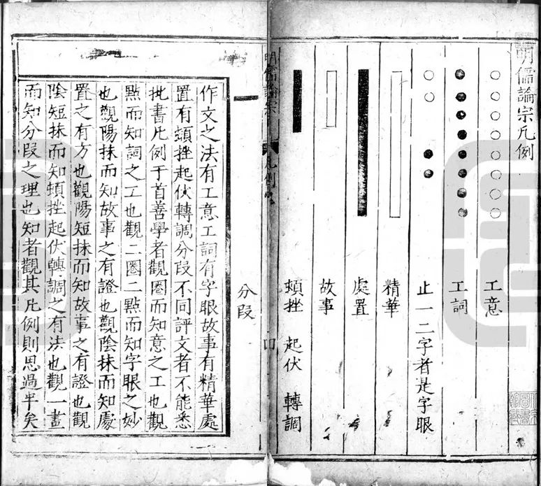 作文之法,有工意、工詞,有字眼、故事,有精華、處置,有頓挫、起伏、轉(zhuǎn)調(diào)、分段不同。評文者不能悉批,書凡例于首。善學(xué)者,觀圈而知意之工也,觀點而知詞之工也,觀二圈二點而知字眼之妙也,觀陽抹而知故事之有證也,觀陰抹而知處置之有方也,觀陽短抹而知故事之有證也,觀陰短抹而知頓挫、起伏、轉(zhuǎn)調(diào)之有法也,觀一畫而知分段之理也。知者觀其凡例,則思過半矣。29