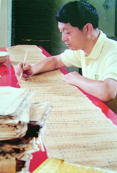 國家圖書館研究館員、國家級非物質文化遺產代表性項目傳承人杜偉生在修復敦煌遺書。受訪者供圖