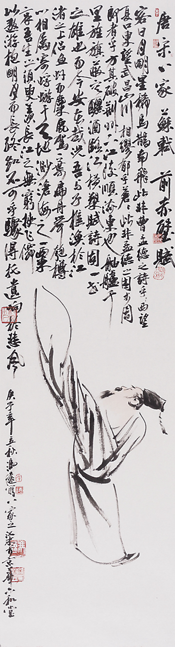 馮遠的人物畫“唐宋八大家”系列,比之“先秦諸子”系列,筆墨更為開張、簡練,凸顯出文人放達的性情和復雜的性格。韓愈、柳宗元、蘇氏三父子、歐陽修、曾鞏等人,文章蓋世,事功驚人,復合型的身份讓他們在政治與文章中游走,人格飽滿又深刻。“唐宋八大家”系列的書法長跋讓人耳目一新。當代國畫的書法缺失,早已引起有識之士的憂慮。沒有毛筆字題款的國畫作品,會降低當代國畫創(chuàng)作的品質。因此,要求當代國畫家提高書法水平的呼聲越來越高。馮遠注重書法的研習,注意書法對畫作的促進與提升。1977年他在浙江美術學院攻讀研究生,三年的系統(tǒng)學習,讓他認識了神秘而博大的傳統(tǒng)藝術世界。浙江美術學院(今中國美術學院)重視書法,是最早設置書法專業(yè)的美術學院,當然要求美術學院學生也要學習書法。馮遠在青少年時代染指丹青,也弄翰墨,進入大學,勤于臨帖,鑄就了自己的筆墨功夫。他的畫作,書法占比較大,“唐宋八大家”系列就是證明。他大幅度題跋,有的是抄錄所繪人物的詩文,有的是書寫個人的感受、感想,以不同的文辭,不同的書體,強化畫作的文化含量。書法對國畫有文辭和筆墨的雙重推進,前者是主題深化,后者是藝術手段,這一點,牛克誠一語中的:“馮遠的人物畫,通過讓堅實的造型功底與書法式的抒情筆墨結合,讓現(xiàn)實主義的創(chuàng)作題材與厚重博大的精神傳統(tǒng)相聯(lián)結,建立起具有鮮明時代感的語言形式。”