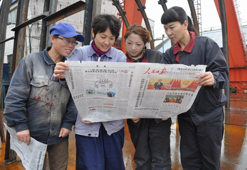 圖為10月31日淮北礦業工程建設公司金城項目部幾名女工施工間隙,通過《人民日報》學習大會精神。