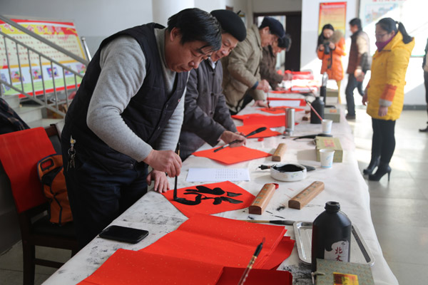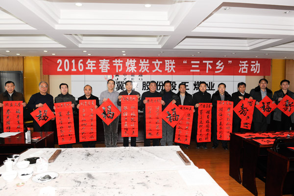 中國煤礦書法家協(xié)會(huì)積極響應(yīng)中國書協(xié)關(guān)于2016年元旦春節(jié)期間開展“萬名書法家送萬‘福’進(jìn)萬家”公益活動(dòng)的通知精神,認(rèn)真組織煤炭系統(tǒng)各企業(yè)書法組織開展送萬‘福’進(jìn)萬家活動(dòng)。1月31日,由中國煤礦文聯(lián)主辦,中煤平朔集團(tuán)公司承辦的“走基層·送溫暖”中國煤礦文聯(lián)文藝志愿服務(wù)走進(jìn)平朔活動(dòng)在平朔礦區(qū)舉行。活動(dòng)現(xiàn)場(chǎng)氣氛熱烈,藝術(shù)家們揮毫潑墨,為平朔礦區(qū)職工寫“福”字、寫春聯(lián),邊創(chuàng)作書畫作品邊和平朔礦區(qū)的書畫愛好者交流創(chuàng)作經(jīng)驗(yàn),筆會(huì)交流活動(dòng)共書寫“福”字200多個(gè),春聯(lián)60多套,創(chuàng)作書法作品50多件、美術(shù)作品10多件。藝術(shù)家們用飽蘸喜氣墨汁的畫筆創(chuàng)作出一件件飽含誠意的書畫作品,為平朔礦區(qū)職工紅紅火火的生活送上美好的祝愿。