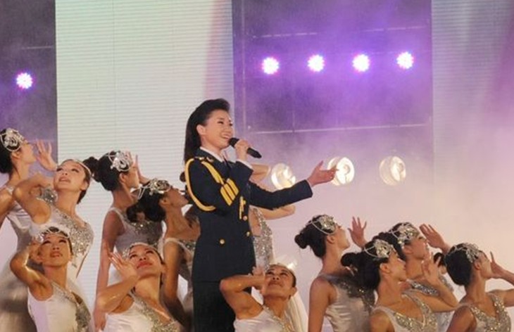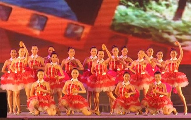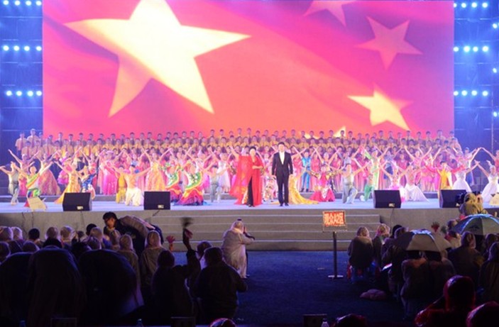 由西山煤電文工團帶來的舞蹈《盛世歡歌》率先登場,青年歌手任真獻唱《夢想帶我去遠方》,歌聲甜美,活力四射;毛澤東鄧小平陳毅朱德4位偉人上場,掀起了演出的第一個高潮,4位特型演員王霙、盧奇、谷偉、王伍福,為觀眾帶來了情景劇《偉人情懷》;陳寒柏、王敏表演的相聲《送你一首歌》唇槍舌劍,詼諧幽默;劉全和、劉全利表演的小品《兄弟拍電影》笑果不凡,令人捧腹;《柳堡的故事》中的二妹子陶玉玲,朗誦了《觀眾是我心中的星》;電影《咱們的牛百歲》中的菊花王馥荔,演唱了京劇《詠梅》。音樂快板、小提琴獨奏、詩朗誦、獨唱、合唱等16個節目一一上演,密雨中,歌聲與掌聲匯成了歡樂的海洋。