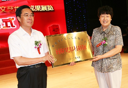 中國煤礦文化宣傳基金會理事長、中國煤礦文聯副主席龐崇婭為平莊藏書基地授牌,平莊煤業工會主席張光偉接牌