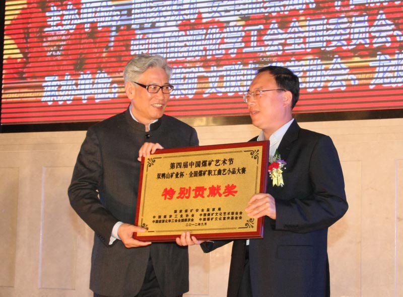 中國煤礦文聯主席梁嘉琨向雙鴨山礦業集團頒發特別貢獻獎,雙鴨山礦業集團紀委書記、工會主席林森領獎