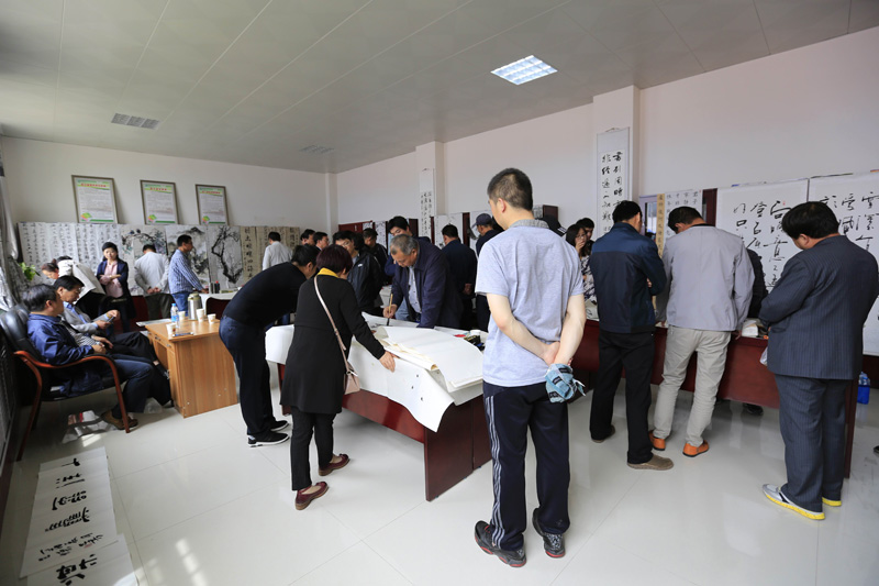 下午,志愿者們馬不停蹄地趕到比較偏僻的新窯煤礦,礦區“職工活動室”里圍滿了職工群眾約200多人,志愿者們顧不上休息,在創作書畫作品的同時,還不斷地與礦區的書法愛好者就書畫作品的創作進行藝術交流。現場氣氛熱烈,每當有一幅字畫作品完成時,職工們都爭相協助將其置于展區,其中不乏有藝術家們為礦區職工“量身定制”的書法作品。直到下午7點,共創作出書畫、印章作品580余件。志愿者們還為20余名剛剛升井的一線礦工們送上現場創作的書畫作品。