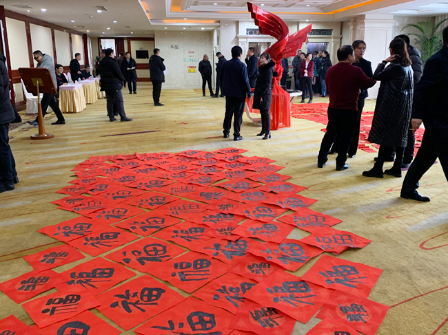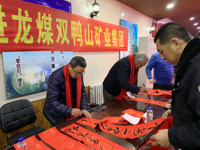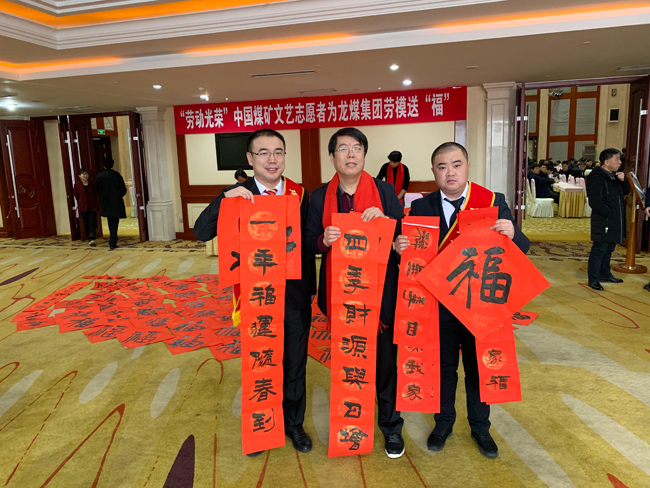 在新時代煤炭工業勞模事跡報告會(龍煤專場)會場外,文藝志愿者們早早作好了準備。“今天是獲得全國煤炭工業先進集體和勞動模范的代表們來開會,我們要多寫一些‘福’字和春聯”送給他們,并通過他們向龍煤集團的礦工兄弟送上新春的祝福。”盛軍邊寫邊說。一旁參加會議的職工代表們喜笑顏開,一張張“福”字和一對對春聯在書法家們的手中寫就,職工們紛紛幫著拿起來鋪到會場前廳的地上。“來,我給二位挑兩幅春聯。”盛軍對著兩名身披綬帶的勞模代表說到。文藝志愿者們一邊寫一邊送,一幅幅飽含春意的“福”字和春聯送到了龍煤集團的勞模和職工代表們手中。