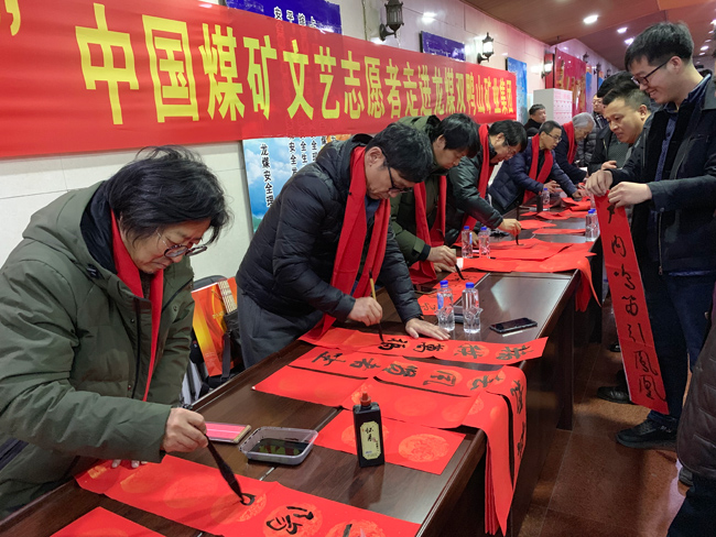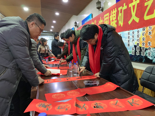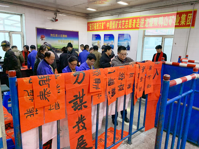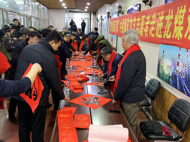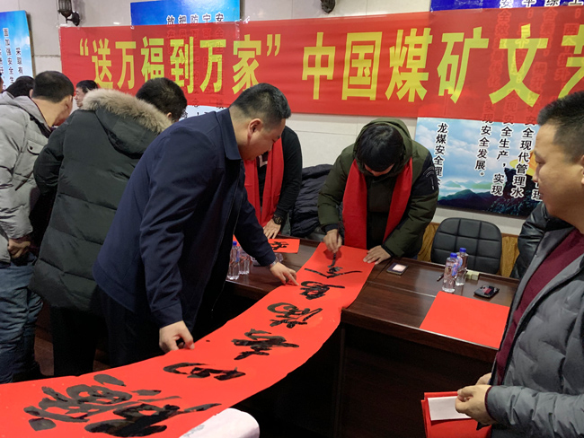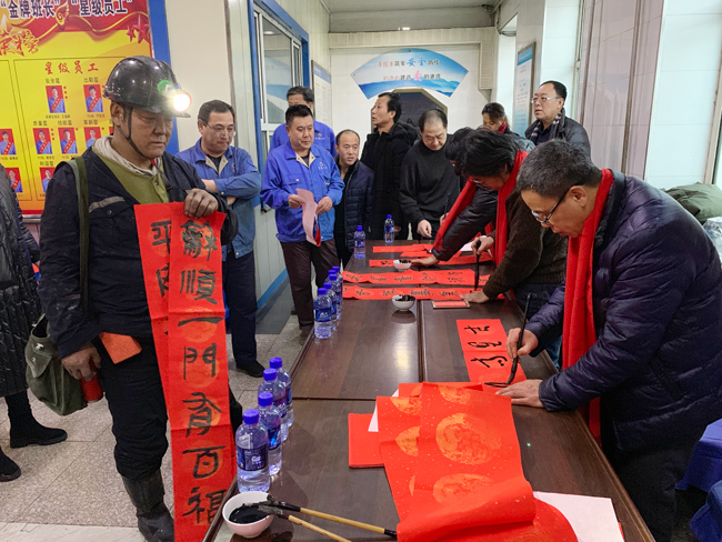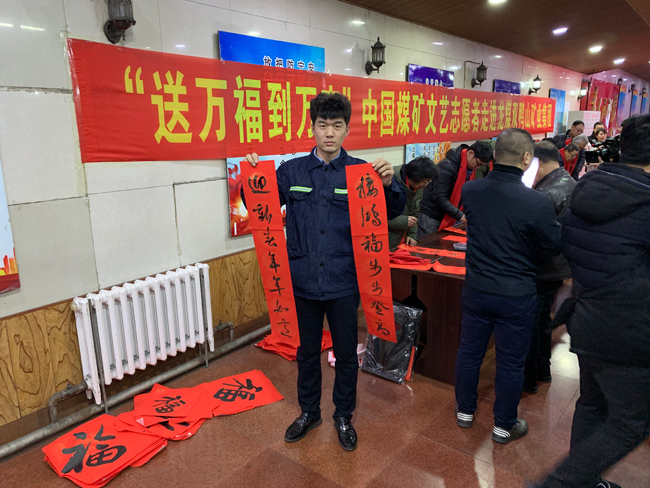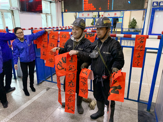 邵靜介紹到:“咱們安排的時間,正好是井下一線礦工們升井的時候,工人們結束了井下的工作之后,能夠看到書法家為他們現場創作作品,能夠在第一時間拿到這些寫著紅彤彤的“福”字和帶有“安全為天”“幸福美滿”等字樣的春聯,這不僅是安全生產文化宣傳,也是給他們最真誠的新春祝福。”