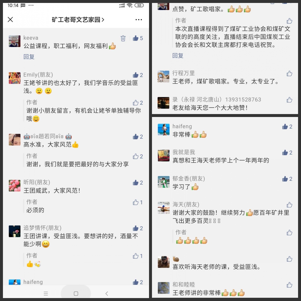 首期課程由中國(guó)煤礦音協(xié)主席、開(kāi)灤藝術(shù)團(tuán)顧問(wèn)王海天主講。在一個(gè)半小時(shí)的聲樂(lè)教學(xué)直播課程中,王海天用深入淺出的講解和精彩的現(xiàn)場(chǎng)示范、精準(zhǔn)專業(yè)的答疑贏得了學(xué)員和網(wǎng)友們的熱情點(diǎn)贊。網(wǎng)友紛紛刷屏:
