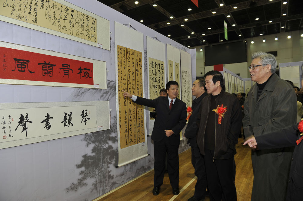 2012年11月28日 汾西礦業杯全國煤礦職工書法展覽,圖為梁嘉琨(右一)參觀展覽。