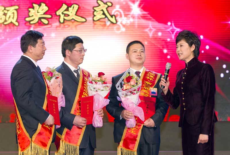 中央電視臺(tái)著名主持人敬一丹和煤礦文工團(tuán)團(tuán)長(zhǎng)瞿弦和主持頒獎(jiǎng)儀式
