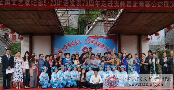 5月23日,第六期全國文藝家高級研修班的38位學員走進貴州省貴定縣中華布依第一村寨音寨進行調研考察,并在村寨舉辦“全國文藝家紀念5.23講話發表73周年公益展演”,以此紀念毛澤東《在延安文藝座談會上的講話》發表73周年,深入貫徹習總書記文藝工作座談會重要講話精神,落實中國文聯“深入生活、扎根人民”工作部署,強化藝術家文藝為民、文藝惠民的服務意識。當天下午2點展演拉開帷幕,精挑細排的12個節目涵蓋了歌舞、器樂、魔術、書畫、布依族傳統藝術以及經典地方戲劇。表演者大多是國家級演員或是國家級非物質文化遺產的傳承人。整場演出鄉親們掌聲陣陣,臺上臺下熱烈互動,男女老少喜笑顏開。最后,展演在《愛我中華》的全場大合唱中落下帷幕。“人民離不開藝術、藝術離不開人民”,走進基層面對面為百姓演出,是六期文藝家班學員努力踐行社會主義核心價值觀最好的實際行動。